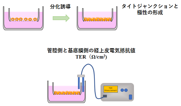 腸上皮が半透膜上を隙間なく覆っている場合には、高い電気抵抗が生じます。この抵抗をTER(経上皮抵抗値)と呼び、試験に使用する腸上皮に穴がないことを確認する試験に用います。また、被験サンプルや成長因子などの添加により、細胞間隙にすき間ができるかどうかをTERによって解析することも可能です。