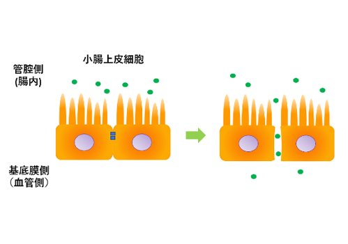 腸上皮を介した栄養成分の吸収経路は細胞内に取り込まれ、基底部側に輸送される方法と、細胞と細胞の間のすき間(細胞間隙)を通り抜ける方法の2種類が存在します。本試験では、細胞内に取り込まれることのない物質を腸上皮の表層側に加えます。細胞間隙を通過した物質は基底部側に透過します。本試験では、お客様の被験サンプルを付与することにより、細胞間隙を透過した被験サンプルを評価します。