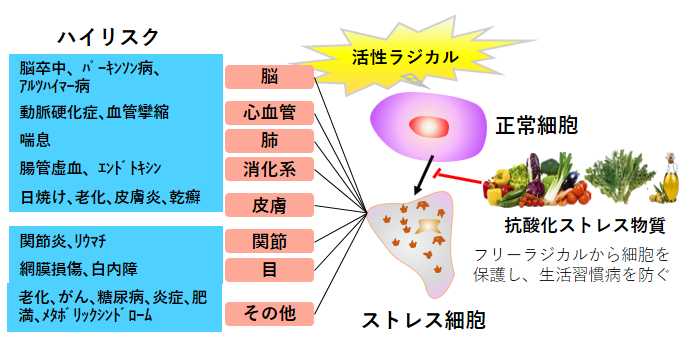 生命維持に関わる酸素の一部は不安定で、さまざまな物質と反応しやすい活性酸素に変化し、細胞内の重要な生理機能(情報伝達・代謝調節・免疫など)に関わっています。一方で、活性酸素は細胞を傷つけ、老化・癌・動脈硬化など、多くの疾患をもたらす原因にもなっています。抗酸化物質は、直接的な活性酸素消去能(スカベンジング能)、生体内の抗酸化酵素の発現促進、あるいは活性酸素を発生する酵素の発現抑制、など種々の経路で酸化ストレスから生体を防御します。本カテゴリーの試験では、被験物質のスカベンジング能、培養細胞を用いた種々の抗酸化酵素の発現や活性の変化、活性酸素量などを測定します。