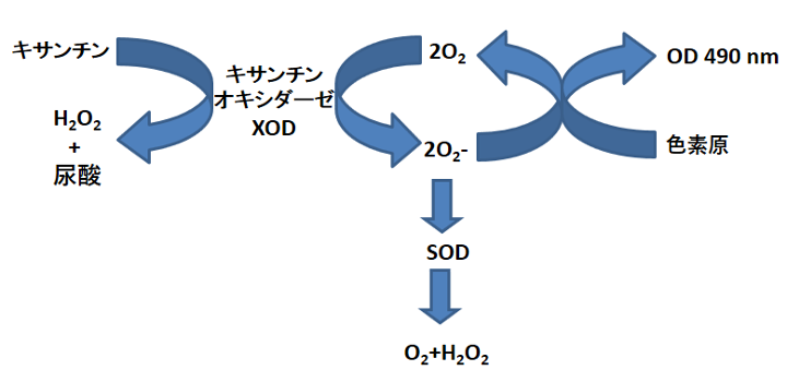 活性酸素の生成反応(キサンチン・キサンチンオキシダーゼ)とSODによる不均化反応とを共役させ、活性酸素による還元呈色が低下します。この吸光度の抑制率をもとに 試料中のSOD活性量を算出します。