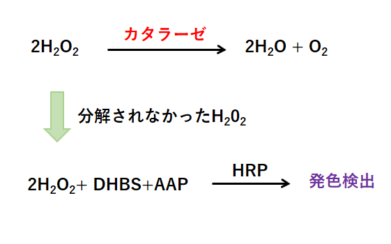 本アッセイは2段階の方法で行います。最初に、カタラーゼを含む試料と既知量の過酸化水素を反応させます。次に、残った過酸化水素を HRP(Horseradish peroxidas)存在下で3,5-ジクロロ-2-ヒドロキシベンゼンスルホン酸ナトリウム(DHBS)とアンピロン(AAP)を反応させ、生じた発色を検出します。
