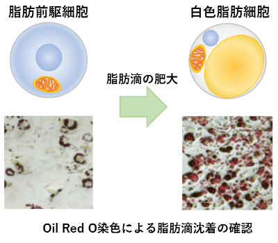 脂肪細胞が成熟すると、『脂肪滴』と呼ばれる器官に脂肪を蓄えていきます。本試験系においては、脂肪細胞が成熟し、脂肪が蓄積する様子をOil Red