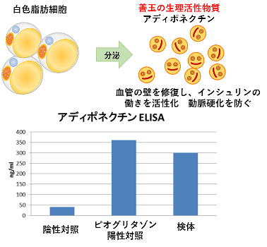 アディポネクチンは、脂肪細胞で産生される分泌タンパク質です。インスリン受容体を介さない糖取り込み促進、脂肪酸の燃焼、細胞内の脂肪酸を減少してインスリン受容体の感受性、肝臓のAMPキナーゼを活性化させることによるインスリン受容体を介したシグナル伝達経路の活性化を行います。また、動脈硬化抑制、抗炎症、心筋肥大抑制など様々な作用を担っています。本試験では、脂肪細胞から分泌されるのアディポネクチン量を測定し、被験物質の抗肥満作用について解析します。