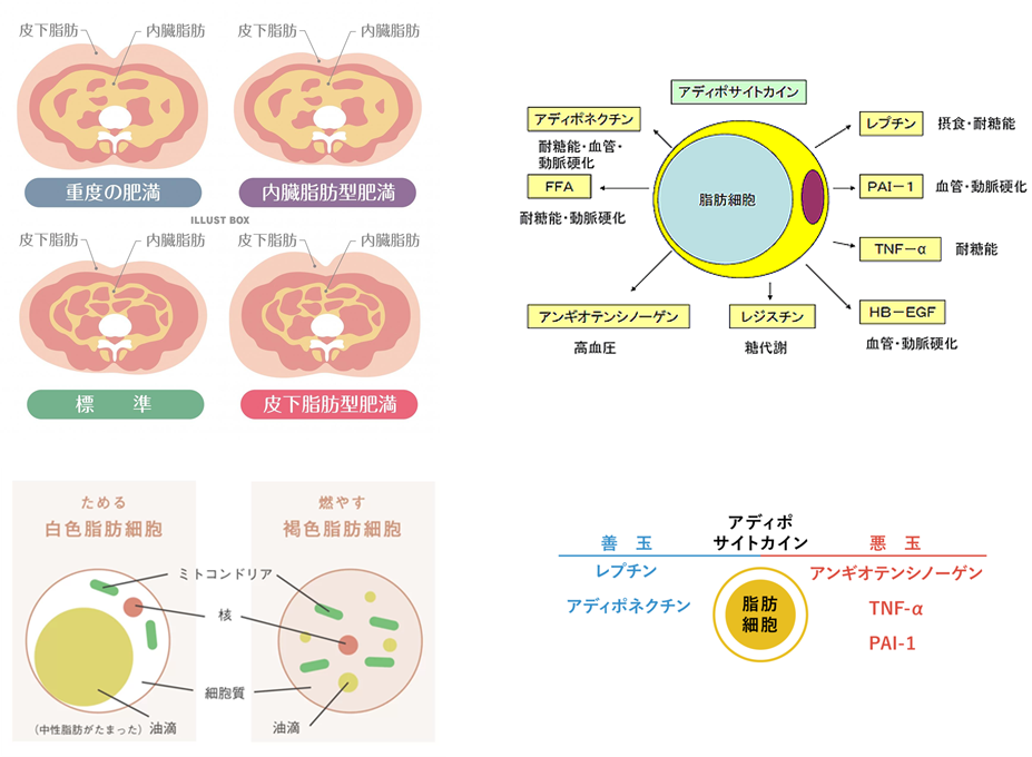 脂肪細胞からなる脂肪組織は、単に脂肪蓄積だけでなく、種々のホルモン(総称してアディポカイン)を分泌する内分泌器官としての役割を担っています。脂肪細胞は前駆細胞から分化し、次第に『脂肪滴』を蓄積すると共に、アディポネクチンなどの善玉ホルモンを合成・分泌していきます。アディポネクチンは長寿ホルモンと呼ばれ、糖尿病や高血圧を抑制すると言われています。しかし、内臓型肥満のように脂肪細胞が肥大化すると、善玉ホルモンの合成は低下し,逆にTNF-αのような炎症性サイトカインの発現が増加します。本カテゴリーの試験では被験物質の脂肪細胞(白色細胞)への脂肪蓄積に及ぼす影響,さらにアディポカインの発現量の変化などについて解析を行い,被験物質の抗肥満作用について検証します。