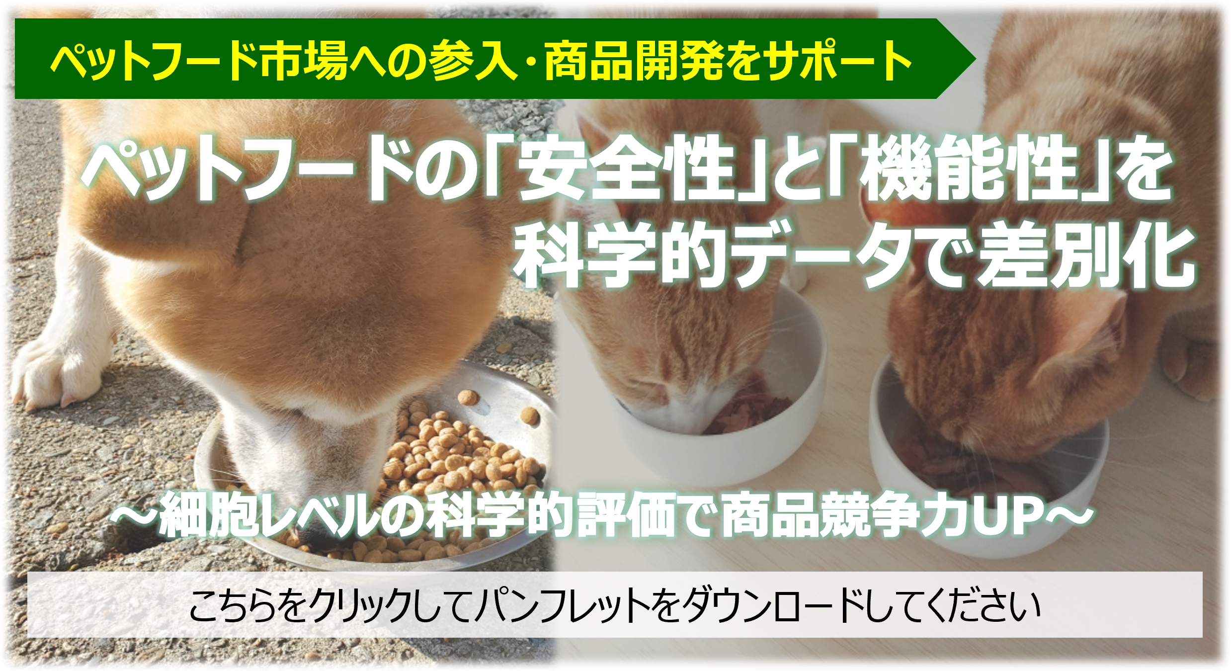 ペットフード市場への参入・商品開発をサポート 細胞レベルの科学的評価で商品競争力UP 細胞をモデルとして用い、ペットフード(原料や最終製品)が生体に与える影響を評価する手法により、従来の成分分析だけでは分からなかった生物学的応答(免疫反応や生理的な変化など)を評価できます。 詳細は以下写真をクリックしていただき、パンフレットをご覧ください。