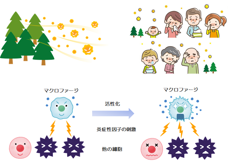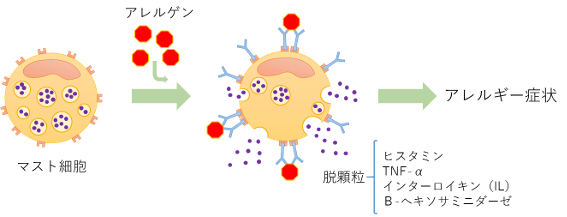 アレルギーとは、免疫反応が体に悪影響のない物質に対して過剰に起きることを指します。免疫反応は、外来性の異物(抗原)を排除する生体防御の役割を持ちますが、過剰な反応はアレルギーを引き起こします。このアレルギーの原因となる物質(抗原)をアレルゲンと呼びます。アレルギー性鼻炎を例としますと、アレルゲンの侵入により、鼻水、くしゃみ、鼻づまりなどの症状が生じます。これらのアレルゲンとしては、花粉やハウスダストなどが挙げられます。体内に入ったアレルゲンは、マスト細胞表面のIgEと結合します。IgEはアレルゲンを介して架橋され、その刺激によって、脱顆粒反応が生じます。顆粒の成分には、ヒスタミンを含むアレルギー反応を促進する物質が含まれ、くしゃみ、鼻水などのアレルギー反応が引き起こされます。